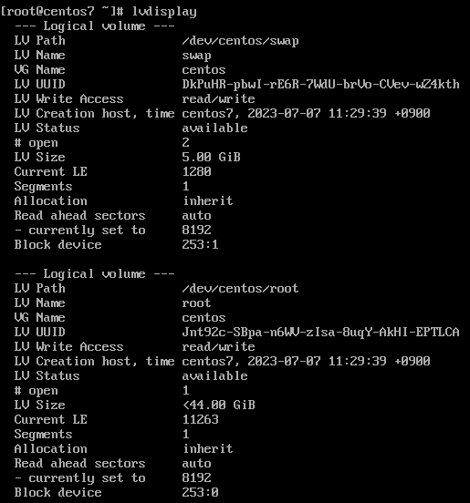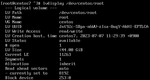 lvdisplay를 이용하여 확인하면 /dev/mapper/centos-root LV가 사용 중인 공간은 여전히 44.00 GiB입니다.