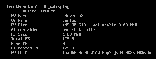 다음으로, centos VG에는 어떤 Physical Volume이 들어있는지 확인해보겠습니다.