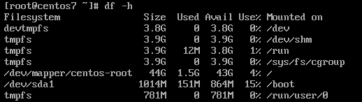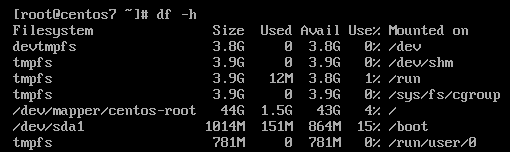 Mounted on이 /인 경우 Filesystem이 /dev/mapper/centos-root로 설정되어 있습니다.