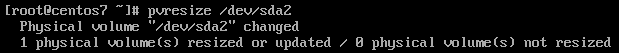 pvresize 명령어를 이용하여, /dev/sda2의 확장된 용량으로 변경해 줍니다.