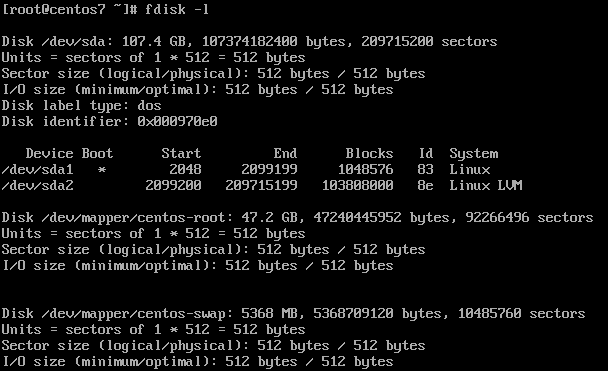 fdisk 명령어를 이용해서 확인하면, /dev/sda 디바이스의 용량이 107.4GB로 증가한 것을 확인할 수 있습니다.